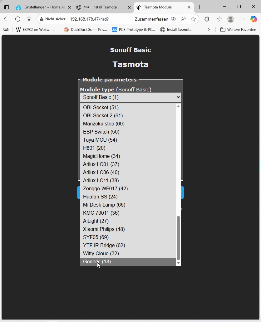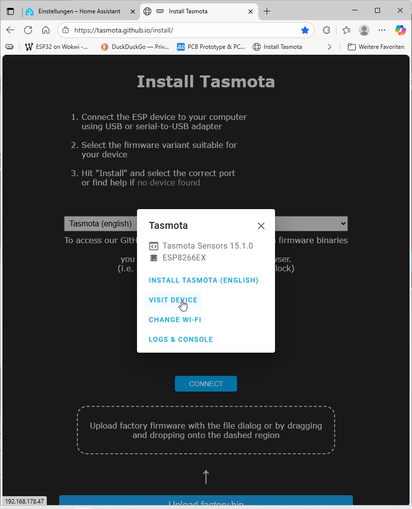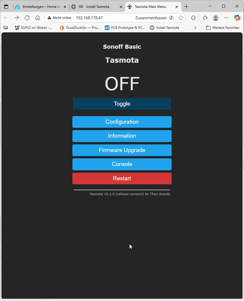 Tasmota ist nun installiert. Tasmota hat einen Webserver, dessen Website alle Einstellungen ermöglicht. Es erscheint in meinem WLAN unter 192.168.178.47 seine Einstellung an: