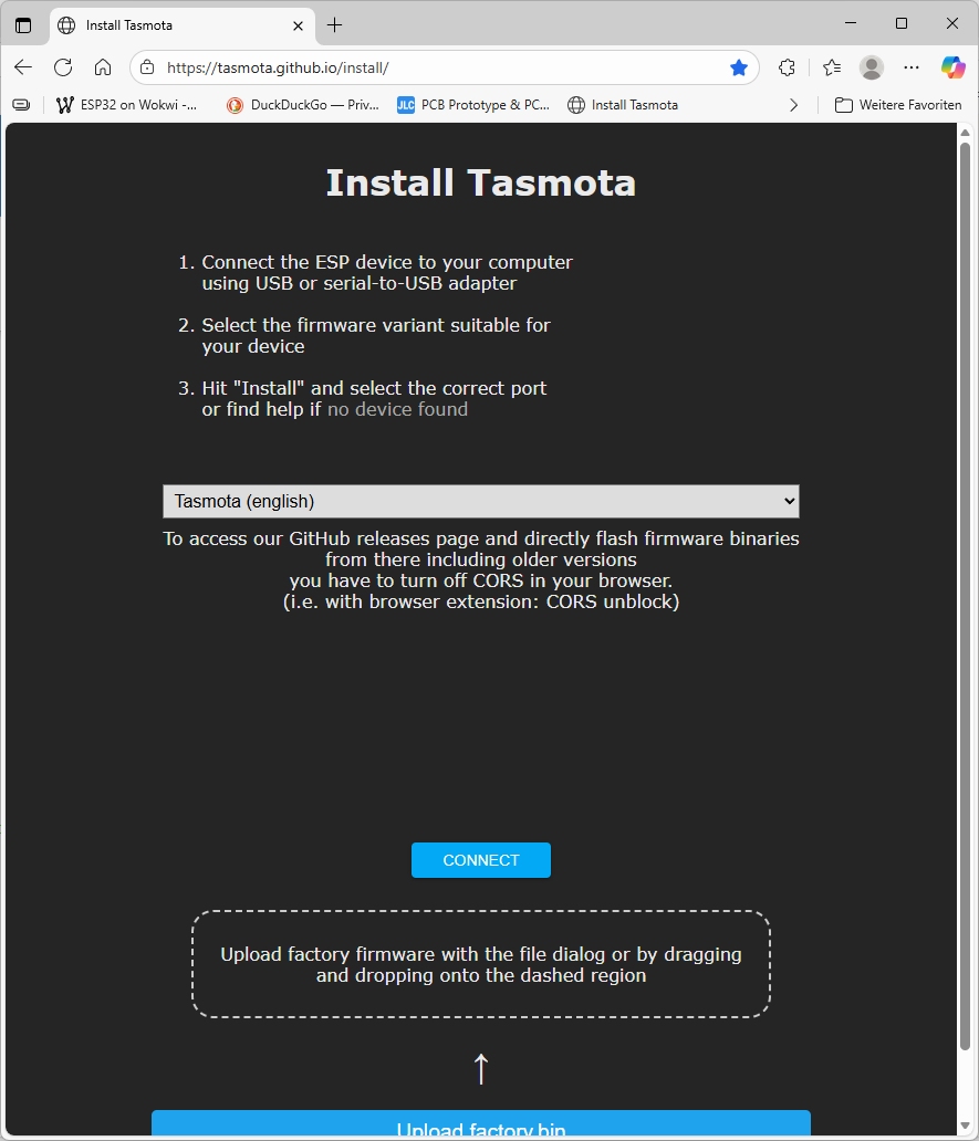 Tasmota auf ESP-Mikrocontrollern zu installieren ist sehr einfach. Es gibt mehrere Möglichkeiten. Es gibt ein ganz tolles Online-Tool unter https://tasmota.github.io/install/. Eine weitere Anwendung ist Tasmotizer (https://github.com/tasmota/tasmotizer/releases), die Anwendung läuft nicht im Netz, hat aber ein paar Vorteile auf die ich in einem anderen Beitrag eingehen werde. Im Folgenden werde ich das Online-Tool verwenden, da es einfacher in seiner Bedienung ist, insbesondere für Neulinge.