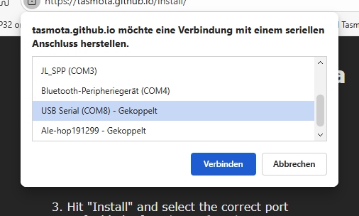 Der ESP-Controller sollte per USB am PC angeschlossen sein, dann auf Connect drücken. Es erscheint eine Auswahl an Ports. Suche das raus, an dem dein ESP hängt. Meist unter "USB Serial Comx)".