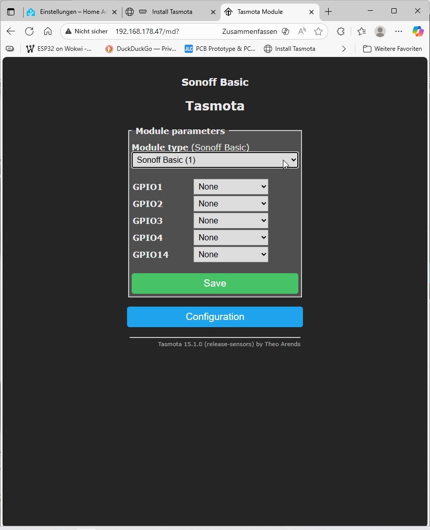 Sonoff Basic ist nicht das richtige Layout für den ESP. Das musst du ändern. Drücke auf Configuration, es erscheind der Modul-Typ: