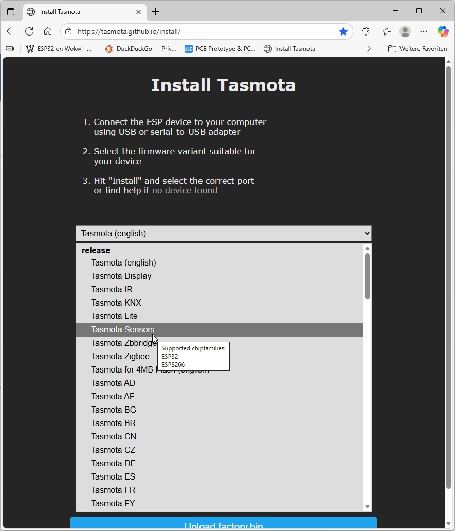 Es muss als Nächstes die richtige Tasmota-Version ausgewählt werden. Es gibt etliche davon. Für Homeassistant ist meist die Version "Tasmota Sensors" zu verwenden, denn nur diese hat Software für viele Sensoren wie den beliebten Umweltsensor ME280 von Bosch, der Temperatur, Luftfeuche und Luftdruck misst. Wähl in diesem Beispiel diese aus: