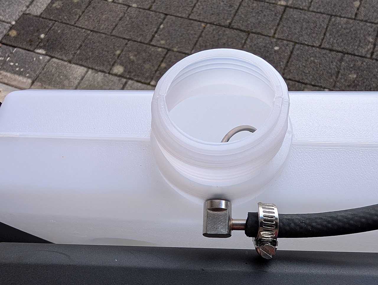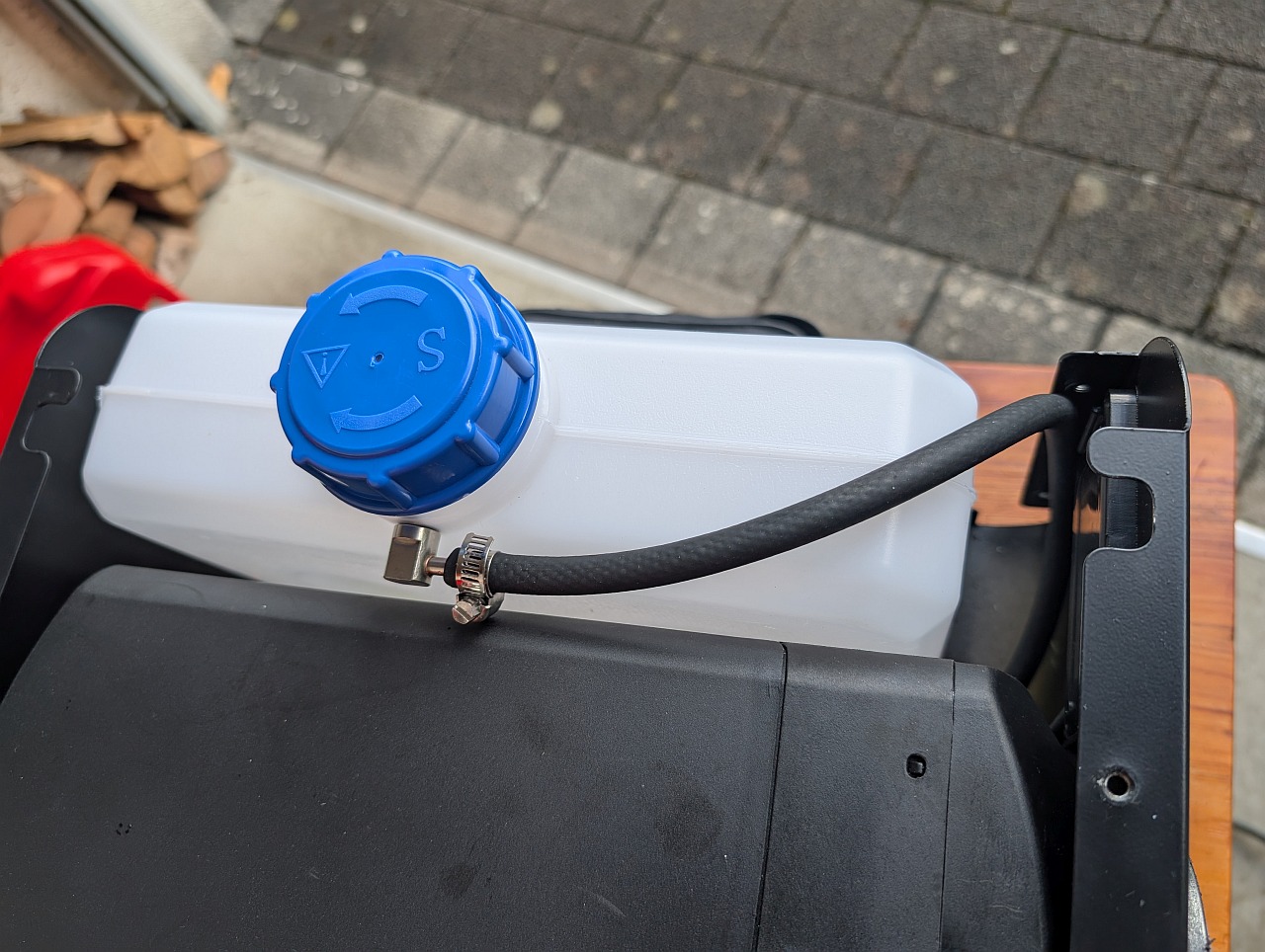 Ich habe einen passenden, stabileren Tank nachgekauft, einen Kraftstoffentnehmer daran installiert, welcher den Kraftstoff oberhalb des Kraftstoffniveaus entnimmt. Dazu noch habe ich den originalen Billigheimer durch einen richtigen Kraftstoffschlauch ersetzt.